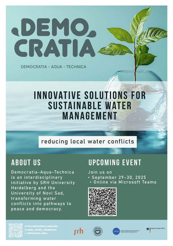Departman za inženjerstvo zaštite životne sredine i zaštitu na radu, Fakulteta tehničkih nauka u Novom Sadu, u saradnji sa SRH Hochschule Heidelberg, organizuje šestu međunarodnu digitalnu konferenciju „Democratia-Aqua-Technica“, koja će se održati 29. i 30. septembra 2025. godine.