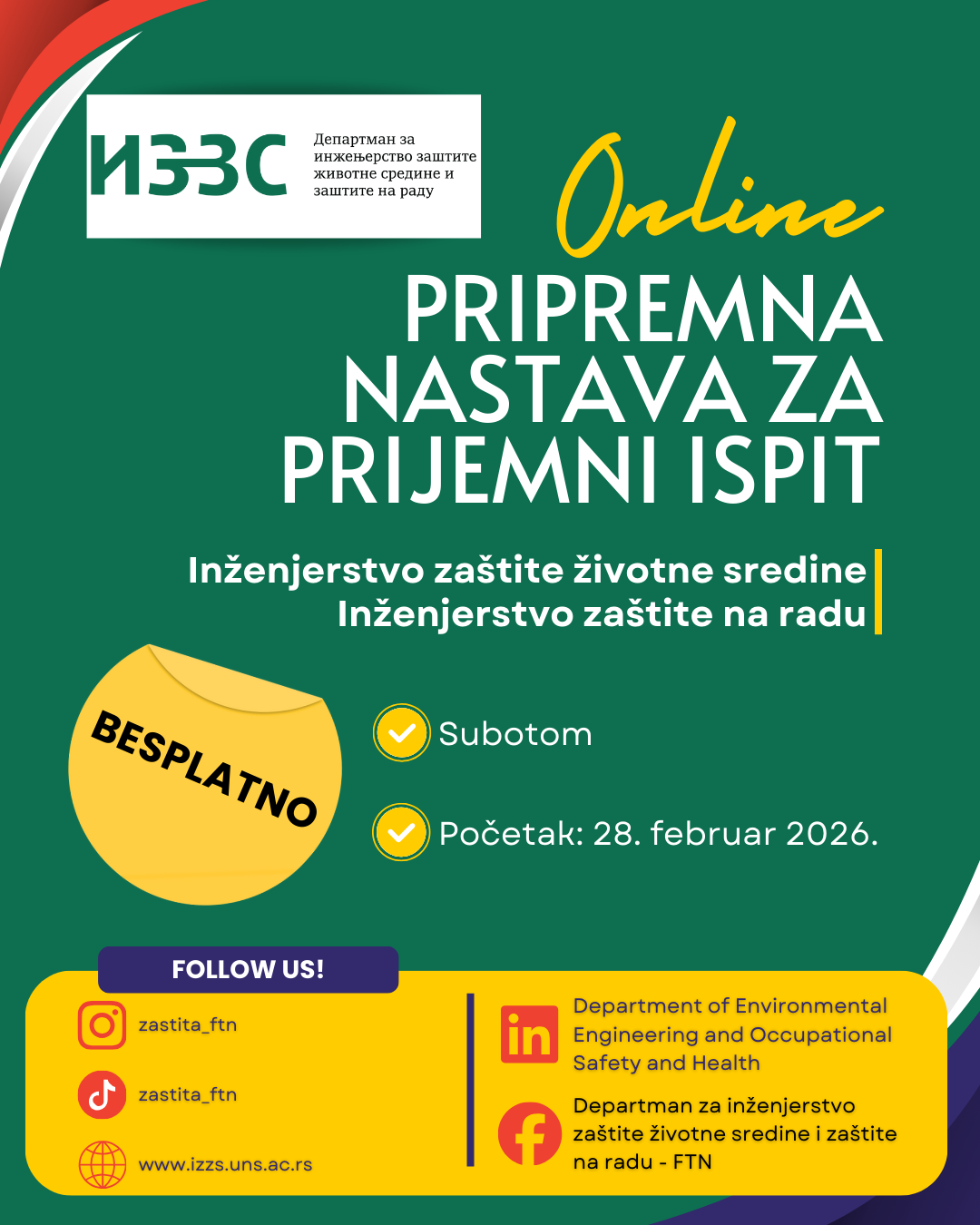 Pripremna nastava će se realizovati subotom u onlajn formatu, sa početkom 28.02.2026. godine, potpuno je besplatna za sve zainteresovane kandidate i drže je profesori zaposleni na Departmanu. Kontakt za prijavu je: ivanamihajlovic@uns.ac.rs.
